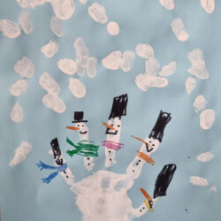 Als erstes malt das Kind am unteren Papierrand den Schnee. Danach malt es seine Hand mit weiß an und drückt die Hand auf das Blatt. (Handabdruck). Nach dem das Bild getrocknet ist, malt das Kind den Hut, die Augen, die Nase, den Mund, den Schal und die Knöpfe auf die „Finger“ drauf. Gern können die Kinder das Bild noch mit Schneeflocken verschönern.